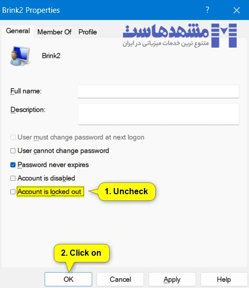 3. در تب General، تیک گزینه “Account is locked out” است را بردارید و سپس روی دکمه OK کلیک کنید. (مطابق تصویر زیر). اگر تیک گزینه Account is locked out خاکستری است و تیک آن فعال نیست، پس اکانت موردنظر در حال حاضر قفل نشده است.